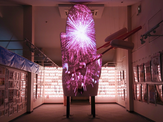 高さ5m、記念撮影スポットとして人気の「世界一大きな岩下の新生姜ヘッド」に、岩下の新生姜で表現した花火が華麗に打ち上げられるプロジェクションマッピングを開催。