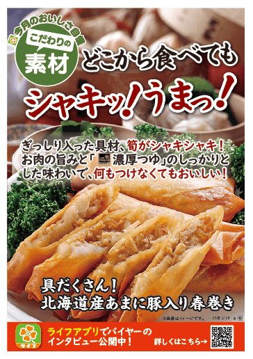 “おいしい”“ワクワク” “ハッピー” をお届けするライフコーポレーションは、「具だくさん!北海道産あまに豚入り春巻き」を2025年2月にリニューアルいたしました。リニューアル前からご好評をいただいておりました皮のパリッとした食感は継承しながらも、具材はあまに豚と筍を増量し、筍の切り方にまでこだわりました。春巻きは春の到来を待ち遠しく思う気持ちや幸せを願う気持ちから、春に食べると良い縁起物とされています。暦の上では季節が春になるこの時期に合わせ、さらにおいしくリニューアルしたライフの春巻きをぜひ一度ご賞味ください。