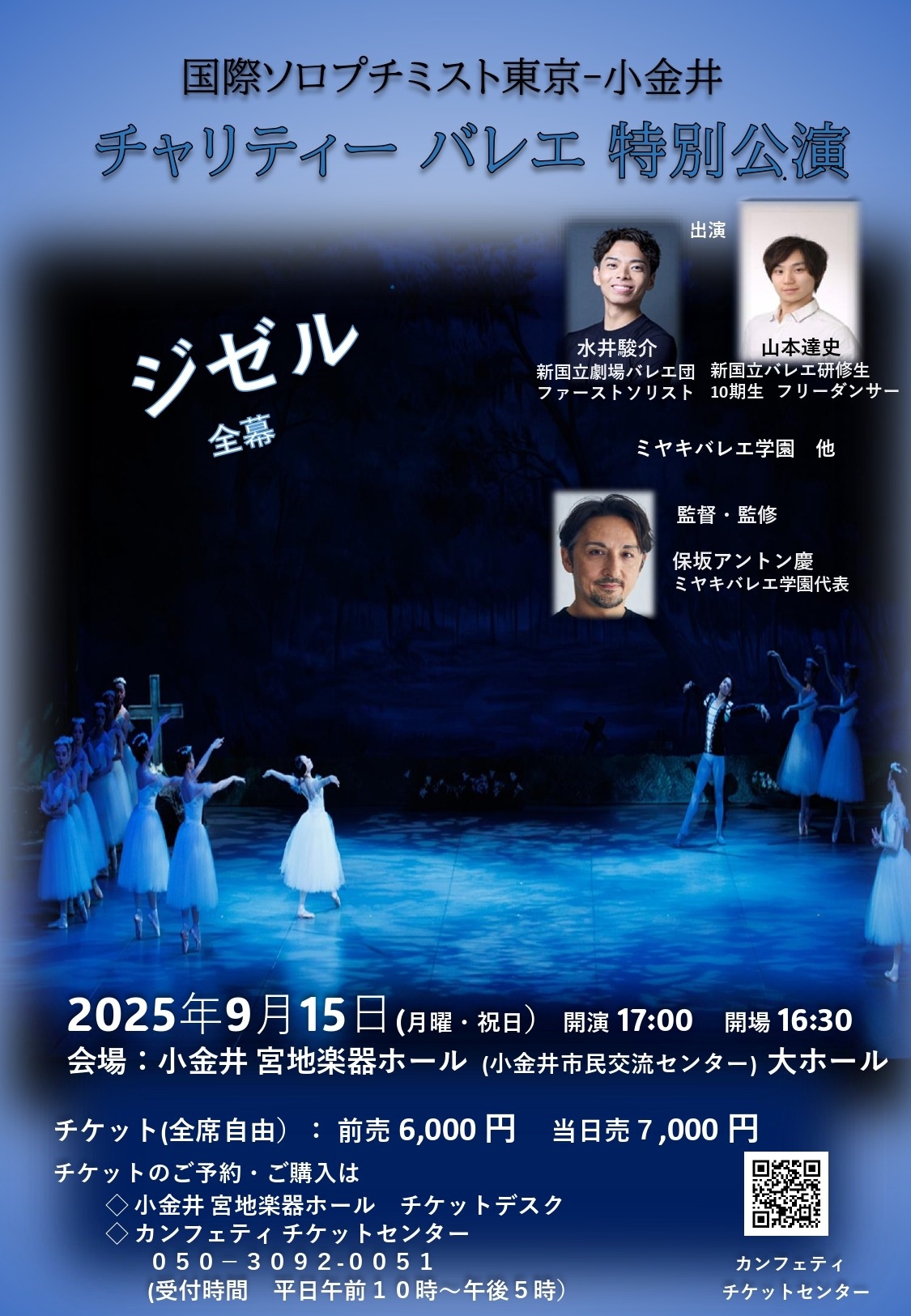 国際ソロプチミスト東京-小金井主催、チャリティーバレエ特別公演『ジゼル(全幕)』が2025年9月15日 (月・祝)に小金井 宮地楽器ホール(小金井市民交流センター) 大ホール(東京都小金井市本町6-14-45)にて上演されます。