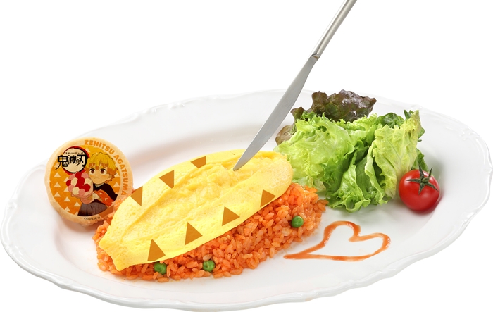レストラン「モリノテラス」では「善逸」をモチーフにした、ナイフをいれると卵が溢れ出し、「善逸」が使う雷の呼吸・霹靂一閃を表現した「我妻善逸のふわトロオムライス」や、「伊之助」をモチーフに、クリンクルカットのポテトで刀を表現した「嘴平伊之助のハンバーグ」が新登場。また、ufotable描き下ろしイラストの「炭治郎」や柱の羽織のモチーフがプリントされたマカロンのデザートプレート「炭治郎と柱のトゥンカロンセット」も提供いたします。