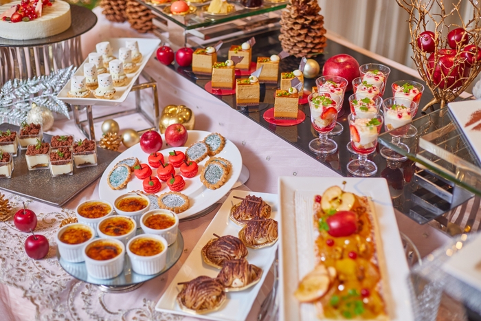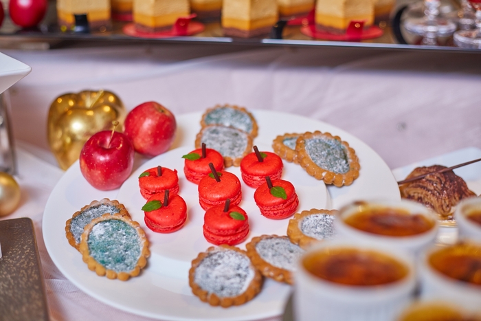 白雪姫と7人の小人たちが住む森の中の賑やかなクリスマスパーティーをイメージしたランチ&デザートブッフェを開催いたします。「小人の家のホットアップルパイ」や「スノーホワイトオペラ」、「宝石鉱山のダイヤモンドジュレ」、「毒リンゴのムース」などのスイーツに加え、お食事のメニューも充実。じっくり煮込んだビーフシチューや、たっぷりミートソースのラザニア、アップルジンジャーソースを添えたローストポークなど、20種類以上のお食事とデザートを食べ放題でご提供いたします。