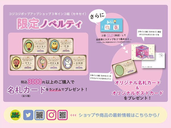 また「コジコジポップアップショップ 3年インコ組(セキセイ)」の店頭ではスタンプカードを配付いたします。スタンプカードにスタンプを2つ集めたお客様には、オリジナル名札カードを1枚プレゼント。スタンプは商品の購入がない場合でも、来店ごとに1日1回まで押すことが可能です。