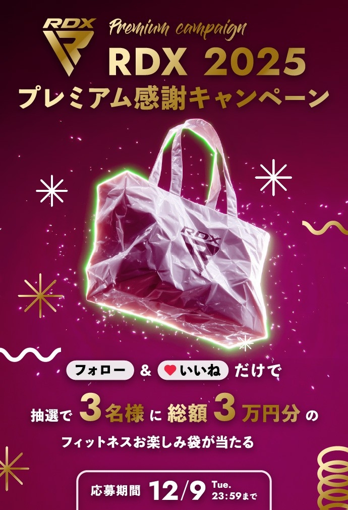 スポーツ全般、生活雑貨を中心に国内総合代理店を務める株式会社Cycle(代表:飯田 航、本社:東京都豊島区)が代理店を務める英国発のボクシング・フィットネスブランド「RDX® SPORTS」は、2025年12月2日(火)~12月9日(火)の期間、格闘技・フィットネス製品など3万円相当の人気商品を詰め合わせた豪華景品が抽選で当たる「RDXプレミアム 感謝キャンペーン2025」を開催します。