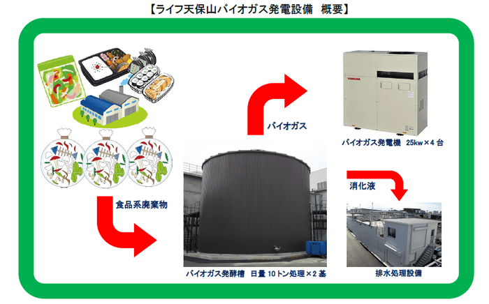 “おいしい” “わくわく” “ハッピー” をお届けするライフコーポレーションは、食品廃棄物の削減と再生可能エネルギーの発電を実現するバイオガス発電設備を新設し、2022年3月に本稼働いたします。