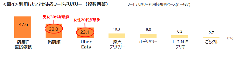 性年代別に見ると、男女30代では「出前館」の利用が最多。「Uber Eats」は男女20・30代の利用が多く、特に女性20代の利用が多い。<図4>