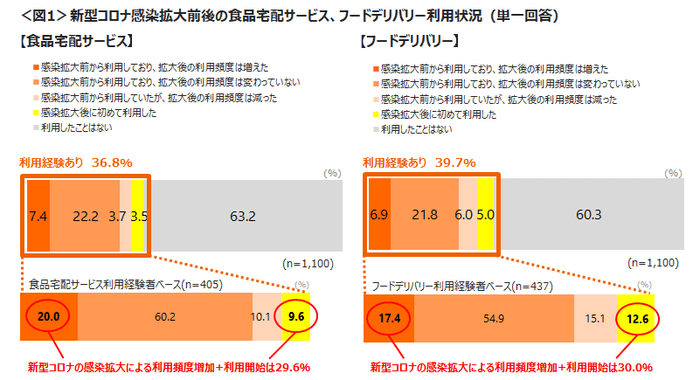コロナ禍で利用広がる 食品宅配サービス・フードデリバリー 利用者の2割が、感染拡大後に頻度増