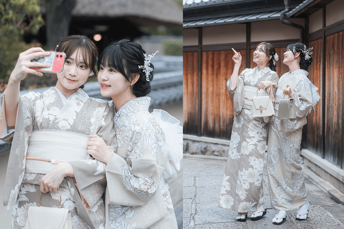「京都着物レンタル夢館」では、伝統的なデザインにとらわれず、ミレニアル世代が好む淡い色彩と近代的なモチーフを取り入れた着物が特徴です。パステルカラーやグレージュといった今どきのトーンが、着物の優雅なシルエットに調和し、京都の美しい街並みにも映えるスタイルを実現しています。若い世代を中心に「自分らしい着物スタイル」を楽しめるこのプランは、SNS映えも抜群で、ファッションとしての新しい着物の魅力を発見できます。