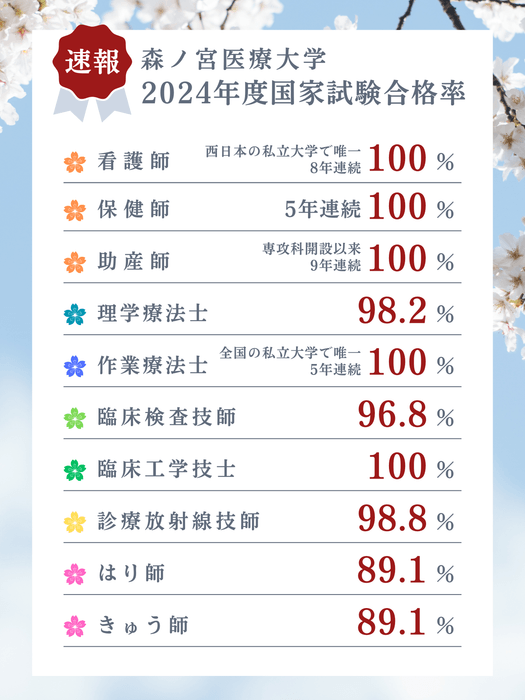 森ノ宮医療大学(大阪市住之江区、学長:青木 元邦)は、昨年度(2024年度)卒業生が挑んだ2024年度国家試験において、本学は全ての職種で全国平均を大きく上回る結果となりました。特に、看護師・保健師・助産師・作業療法士・臨床工学技士の5資格は合格率100%を達成しました。