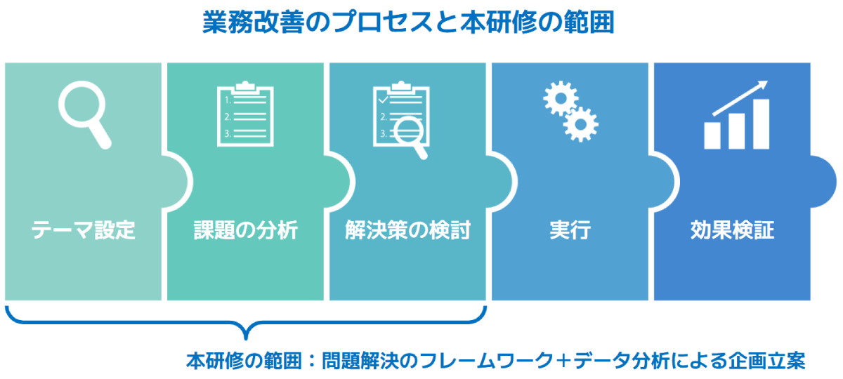 「業務改善のためのデータ活用実践講座」は、問題解決とデータ分析を組み合わせて業務改善へつなげる企画立案の実務手法を、演習を通じて体系的に習得できるプログラムです。業務改善の企画立案ステップに焦点を当て、テーマ設定から課題の分析、解決策の検討までを一貫して扱い、現場で有効に機能するデータ活用の実践力を養成します。なお、本講座は特定ツールに依存しない設計のため、環境を問わず再現性の高いスキル習得が可能です。