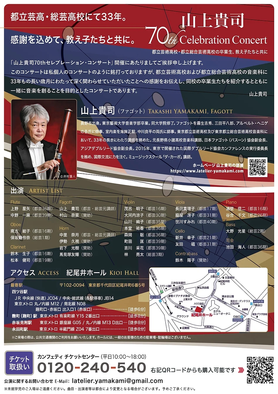 ファゴット奏者・山上貴司の70歳を記念して、長年指導に尽力してきた都立芸術高校・都立総合芸術高校の教え子たち、仲間たちが集結。
