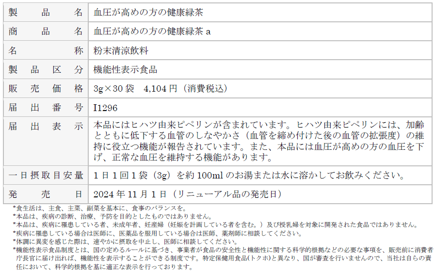 当社は、血圧が高め※1の方の血圧を下げ正常な血圧を維持することに加え、加齢とともに低下する血管のしなやかさ※2の維持にお役立ちできればとの想いから、「血圧が高めの方のタブレット」、「血圧が高めの方の健康緑茶」の届出表示を見直しました。