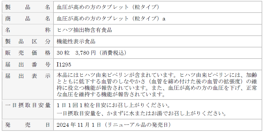 大正製薬株式会社[本社:東京都豊島区 社長:上原 茂](以下、当社)は、「ヘルスマネージ」シリーズの機能性表示食品「血圧が高めの方のタブレット」、「血圧が高めの方の健康緑茶」の届出表示に、「加齢とともに低下する血管のしなやかさ(血管を締め付けた後の血管の拡張度)の維持に役立つ」機能(ヒハツ由来ピペリンの機能)を追加したリニューアル品を11月1日(金)より、当社オンラインショップ「大正製薬ダイレクト」等で発売します。