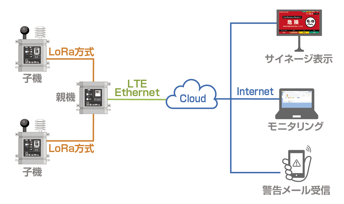 「SisMil」は、WBGTなど様々な環境測定値を自動で計測・遠隔監視できるクラウド型システムです。任意の場所に設置した子機(JIS準拠の電子式WBGT指数計)で温湿度と黒球温度を計測し、親機(ゲートウェイ)を経由してクラウドへデータを送信します。複数箇所の値を自動で計測・一元管理することで、離れた場所からでも危険な状況をいち早く察知できます。また、測定値の記録によって作業環境を管理できるため、作業者や利用者の安全にお役立ていただけます。