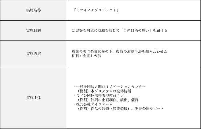 一般社団法人関西イノベーションセンター(代表理事:早乙女(そうとめ) 実(みのる)、以下当社団)と、株式会社マイファーム(代表取締役:西辻(にしつじ) 一真(かずま)、以下マイファーム)、NPO団体未来表現教育ラボ(代表:大野(おおの) たかよし、以下Mラボ)の3社は共同で、複数の演劇手法を融合させ「自産自消※の想い」を届ける、『ミライノチプロジェクト』を始動いたします。
