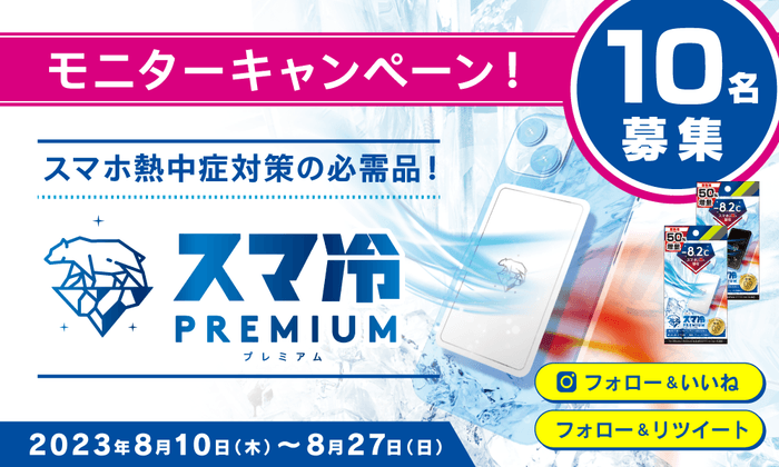 「スマ冷え Premium」をお試しいただけるモニターを10名募集。当選者には「スマ冷え Premium」をプレゼントいたしますので、実際にお使いいただき1枚以上の画像、もしくは動画と一緒にTwitterもしくはInstagramやブログでレビューしてください。