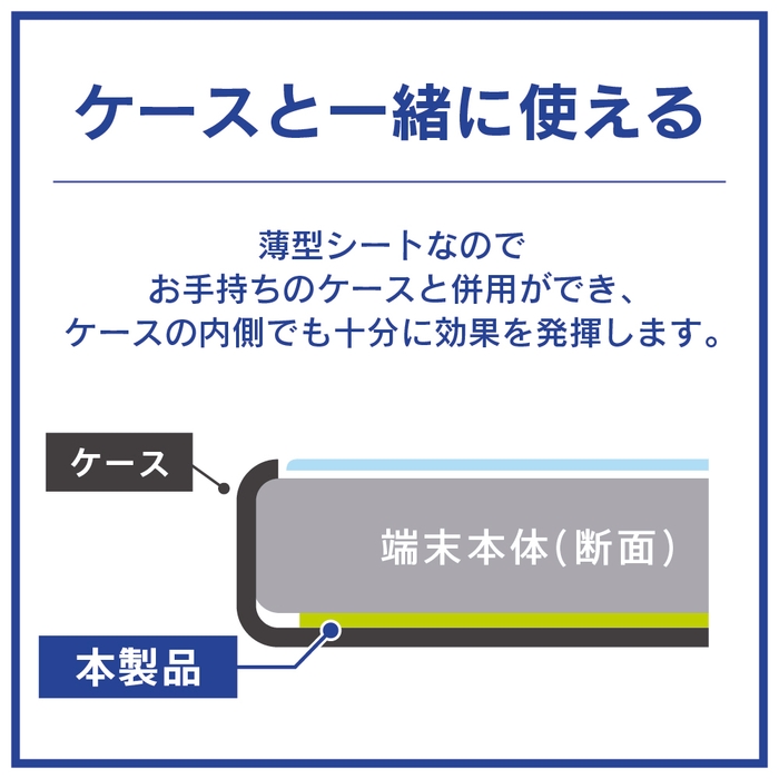 「スマ冷え Premium」は0.9mmの極薄設計のため、スマホに貼った上からケースもつけられます。また、3層蓄熱構造により、ケースの内側でも効果を発揮し、効果が損なわれることはありません。
