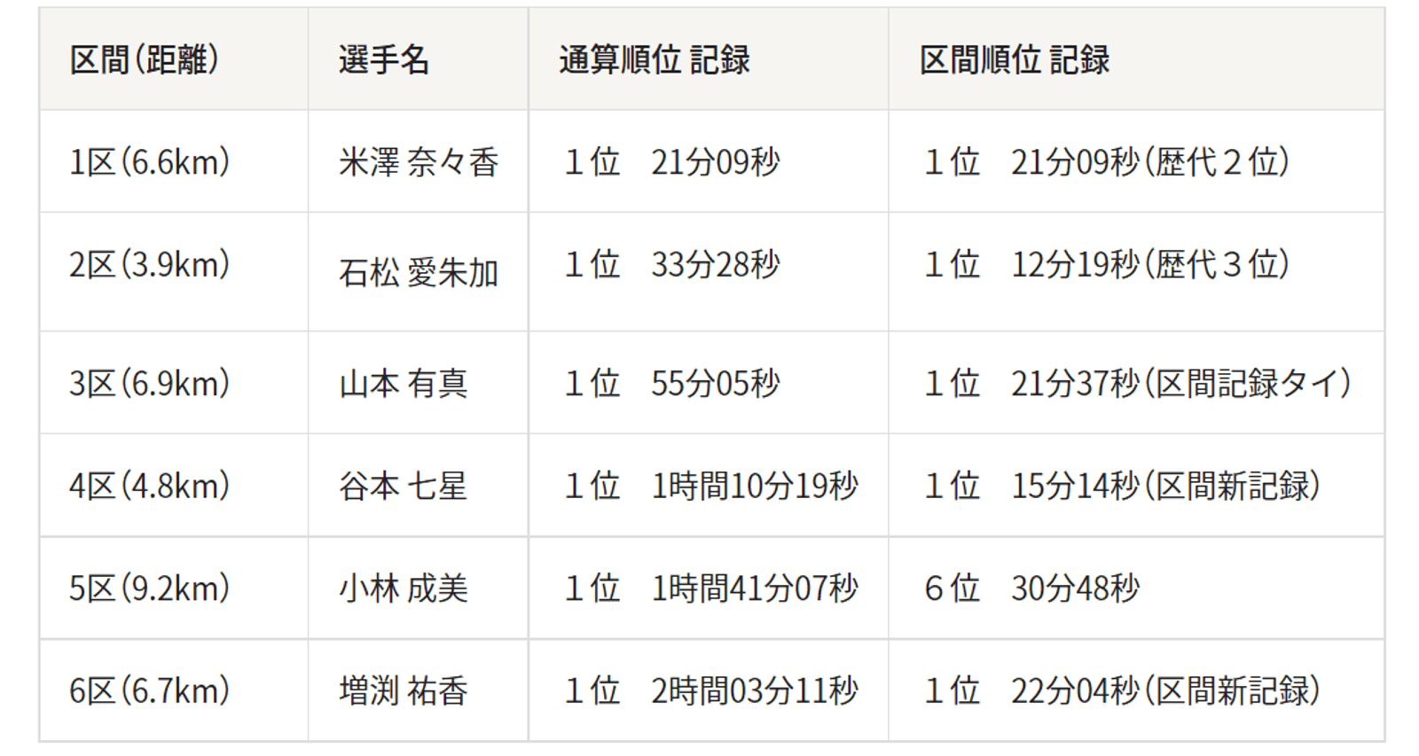 総合タイムは2時間03分11秒で、2位のチームに2分31秒と大差をつけて、1区から一度も首位を譲らない女王のレースで圧倒しました。