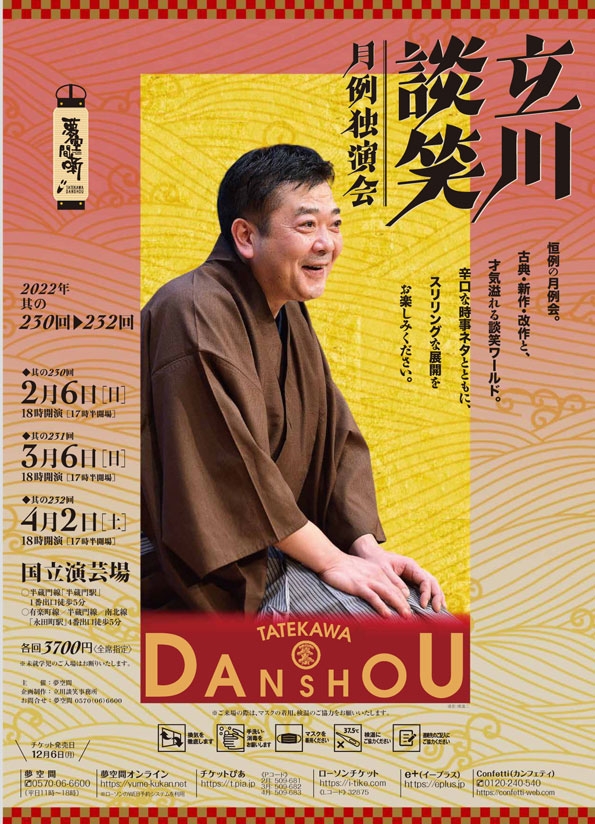 株式会社夢空間(東京都千代田区)主催による『立川談笑 月例独演会 其の230回』が2022年2月6日 (日)に国立演芸場(東京都千代田区)にて上演されます。チケットはカンフェティ(運営:ロングランプランニング株式会社、東京都新宿区、代表取締役:榑松 大剛)にて発売中です。