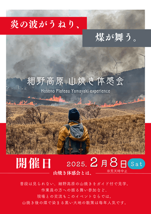 ツアー内容は、現地の作業者から細野高原の歴史や山焼き作業について解説、山焼き終了後の焼けた直後の「煤が舞う漆黒の大地」のガイドウォークを予定しています。