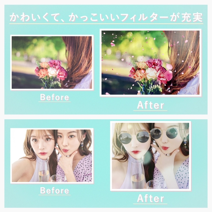 自然な美肌加工ができるビューティーフィルター。花びらを散らしたり雨を降らせたりできるエフェクト機能。