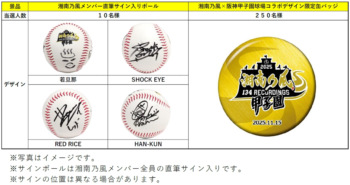 当日、阪神甲子園球場内飲食売店で1会計当たり1,500円以上ご購入いただいた方の中から抽選で10名様に「湘南乃風メンバー直筆サイン入りボール」を、250名様に「湘南乃風×阪神甲子園球場コラボデザイン限定缶バッジ」を1つプレゼントします。