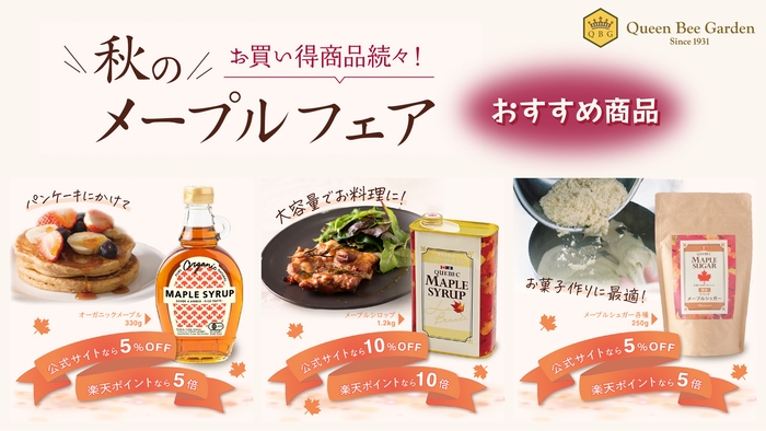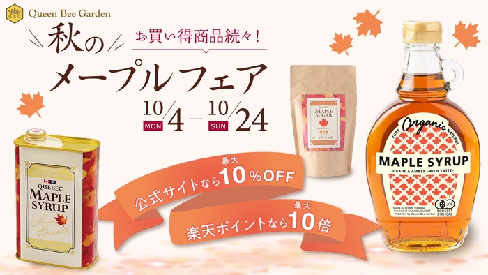 今年創業90年を迎えた天然甘味料専門メーカー 株式会社クインビーガーデン(本社:静岡県静岡市、代表取締役社長:青木 均)は、公式オンラインショップにて、10月4日(月)〜24日(日)の期間限定で「秋のメープルフェア」を開催いたします。