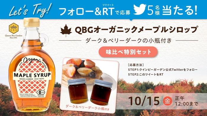 樹液の採集時期によって色や風味が変わるメープルシロップの特徴を体感していただきたいという思いから、「QBGオーガニック・メープルシロップ(アンバー)」と、ダーク・ベリーダークの小瓶が付いた「メープルシロップ味比べ特別セット」を5名様にプレゼントいたします。
