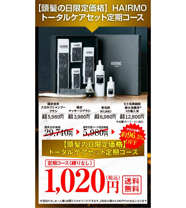 ・HAIRMO 頭髪ケアキャンペーンコースは購入の度にお申込をしなくても初月はトータルケア 4 点セット、2ヶ月目以降は「IKUMO 育毛剤 1 本(100ml)」「ヒト毛根細胞順化培養液 X5 導入液 1 本(20ml)」をお届けする定期コースです。初月は1,020 円(税込)、2ヶ月目以降は9,980円(税込)の特別価格にてご購入いただけます。
