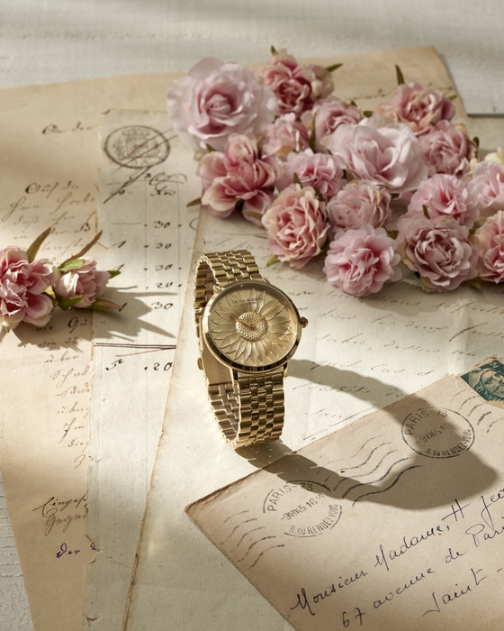繊細な花びらとマイクロビーズをエッチングで表現した3Dモチーフは、見る者を惹きつける優雅さと華やかさを兼ね備えています。今回の新作では、ひと回り大きい35mmケースを採用することで、立体的な花びらのディテールがよりダイナミックに映え、手元に存在感をプラス。
