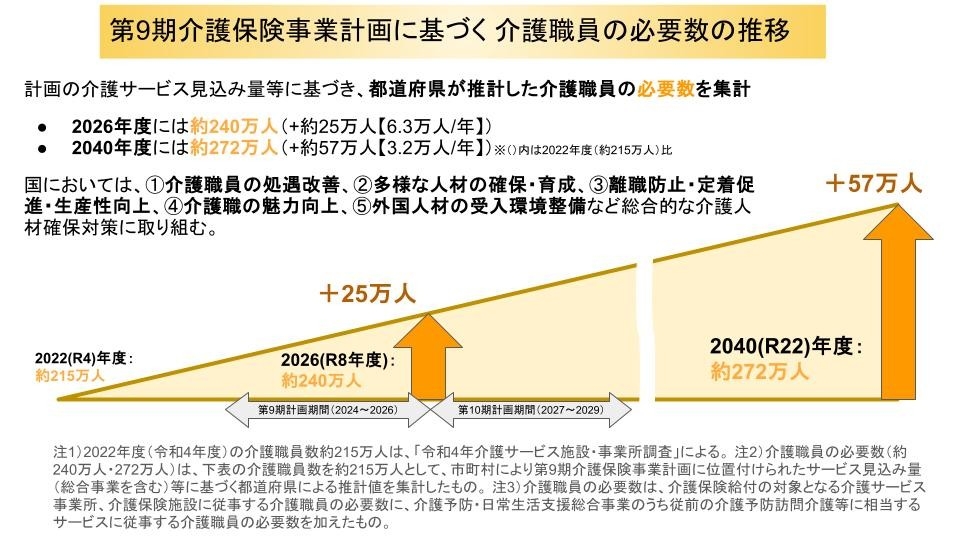 超高齢社会を迎えた日本において、介護職の人材不足は喫緊の課題となっています。第9期介護保険事業計画によれば、2022年度の約215万人から、2026年度には約240万人(年間約6.3万人の増加)、2040年度には約272万人の介護職員が必要とされています。つまり、今後わずか数年で約25万人もの介護人材を新たに確保しなければならない状況です。