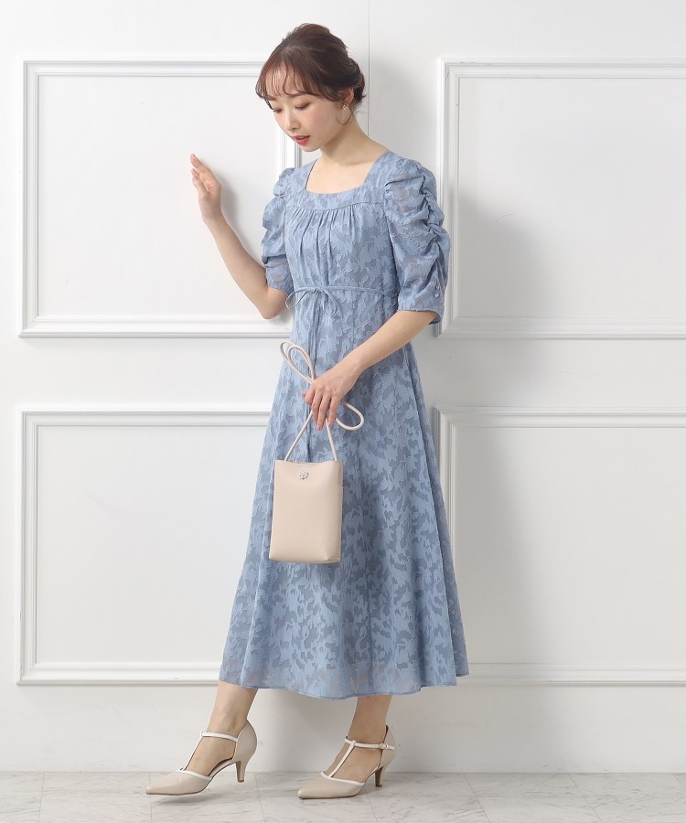 ボタニカル柄のシアーなカットジャガート素材を使用したスクエアワンピース。