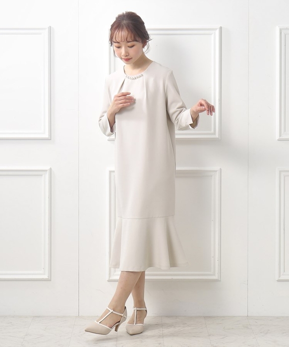 首元に大ぶりなパール調の付属が付いた華やかなワンピース。