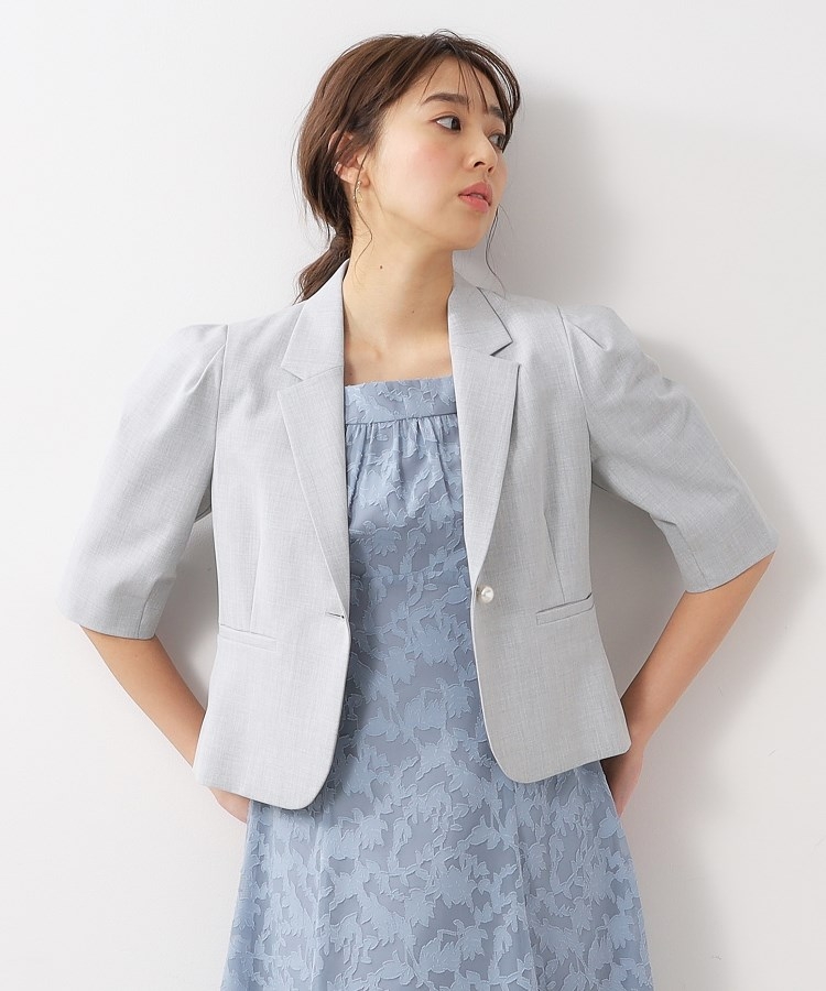 パール調ボタンがアクセントのタックスリーブ半袖ジャケット。