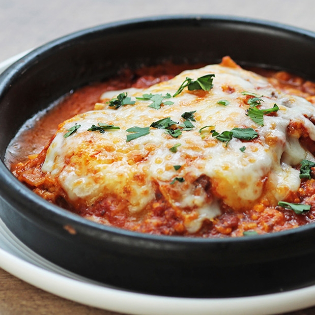 サルヴァトーレ特製ミートソースのラザニアを窯焼きスタイルで仕上げました。