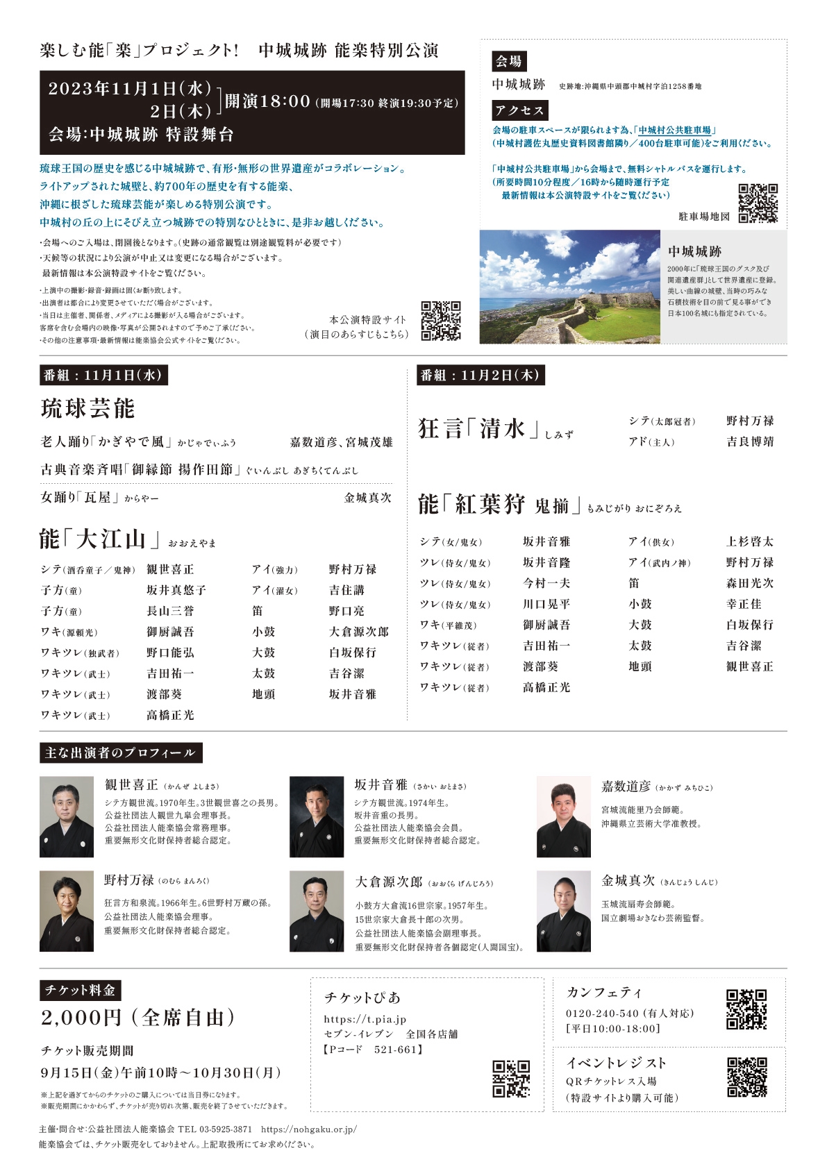 公益社団法人能楽協会主催、「楽しむ能『楽』プロジェクト! 中城城跡 能楽特別公演」が2023年11月1日 (水) ~2023年11月2日 (木)に中城城跡 特設舞台(沖縄県中頭郡中城村字泊1258番地)にて上演されます。