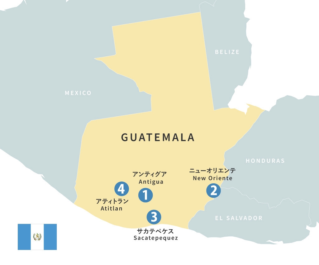 中米最高水準のスペシャルティコーヒー生産地として名高いグァテマラ。日本の1/3より小さい国土ながら、厳しい寒暖差や豊富な雨量、火山灰の土壌などコーヒー栽培には絶好の条件が揃っており、高品質のコーヒー豆が生産されています。今回にしむら珈琲店では、グァテマラコーヒーの多様性を発見していただける、生産エリアも精選方法も異なる4つの銘産地コーヒーの飲み比べセットを企画しました。それぞれを飲み比べて違いをお楽しみいただける、コーヒー好きにはたまらないセットとなっております。