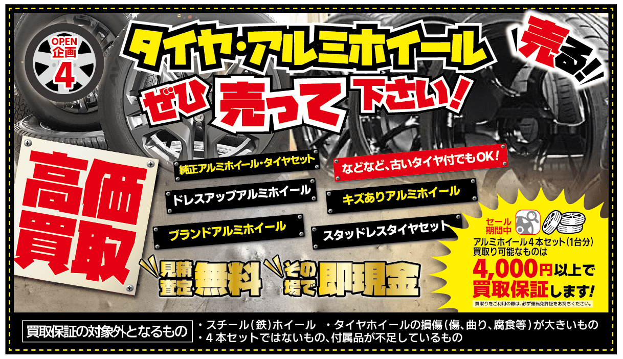 OPEN企画(4) タイヤ・アルミホイールぜひ売ってください!買取額4,000円以上を保証!