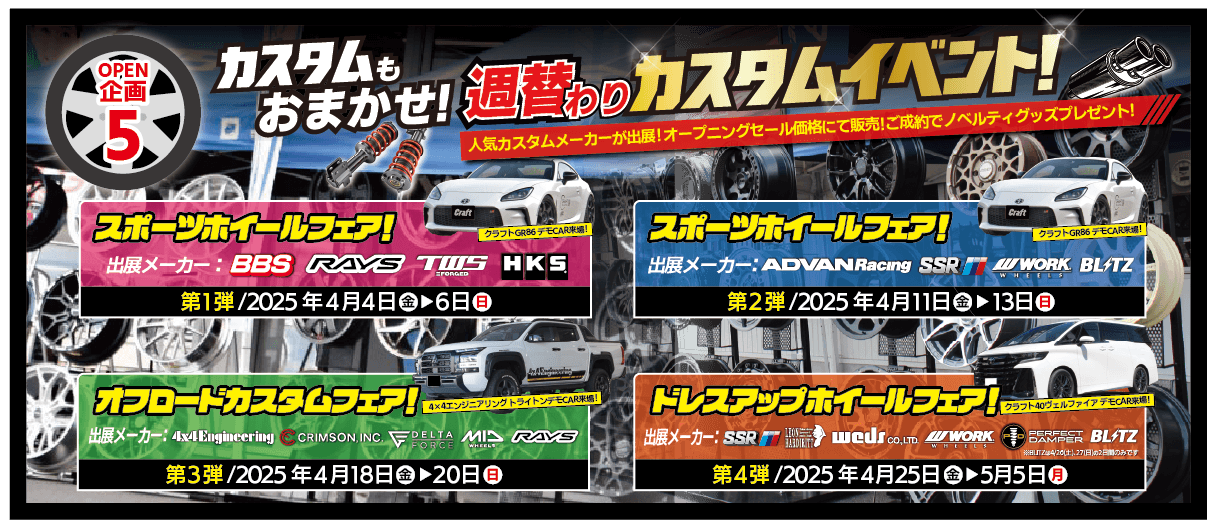オープン記念セールでは、人気のホイールメーカー「RAYS(レイズ)」「WORK(ワーク)」「4x4 Engineering Service(フォーバイフォーエンジニアリングサービス)」などのホイールとタイヤのセットを特別価格で販売するなど、お買い得な企画を多数ご用意します。