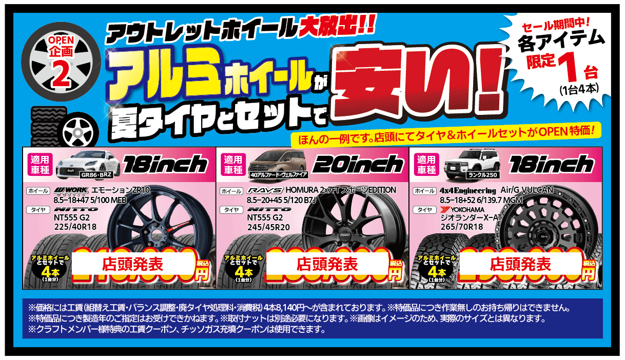 OPEN企画(2) アウトレットホイール大放出!アルミホイールが夏タイヤとセットで安い!