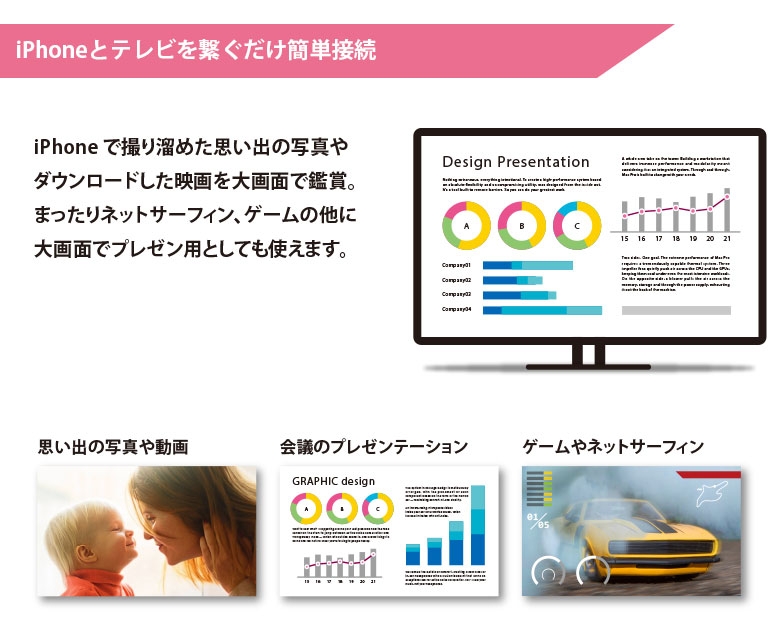 iPhone やi Pad などのデバイス の映画、テレビ 番組、ユーチューブ、ゲーム、オーディオ、写真、ビデオ、アプリケーション、 プレゼンテーション、Web サイト、スライドなどを最大1080pのHD画質でテレビ、モニター、投影型スクリーン、またはHDMIポートが搭載するディスプレイに同期して表示できます。