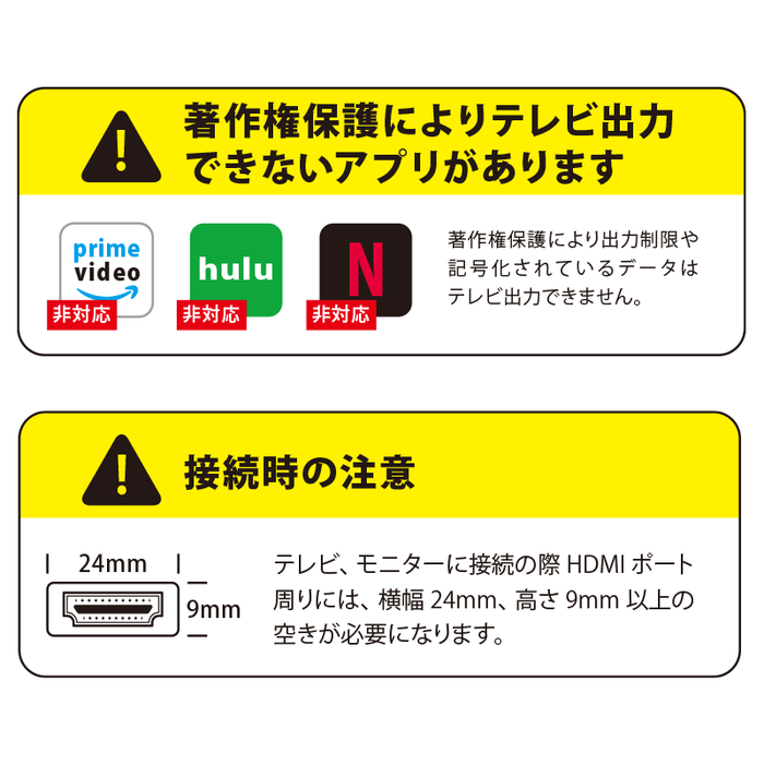 デバイスとディスプレイを繋ぐだけの簡単接続設計です。 prime video / hulu /Netflix など著作権保護により出力制限や記号化されてデータはテレビ出力ができませんのでご了承ください。