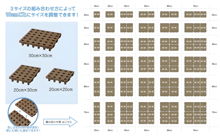 『20×20cm・20×30cm・30×30cm』の組み合わせ方によって10cmごとにサイズを調整できるので、広く全面に敷いて使用したり、必要な所にだけ敷いて使用したりとスペースや収納物に合わせてサイズを調整することができます。