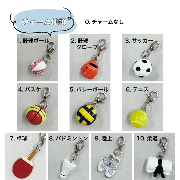 ユニフォーム型ストラップには、野球、サッカー、バスケなどいろいろなスポーツのミニチャームが選べます。それぞれのスポーツを表すチャームで、お好みのスタイルにカスタマイズできます。お気に入りのスポーツを身につけて、楽しみましょう!
