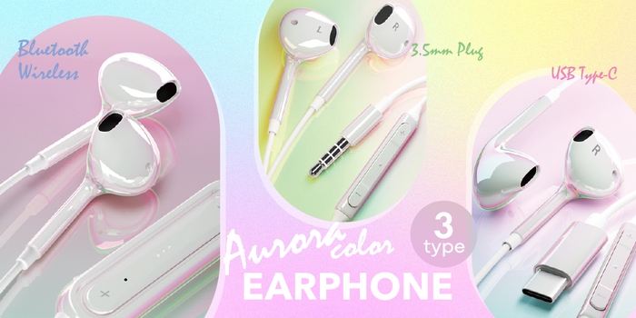 オーロラカラーのきらびやかなステレオイヤホンの無線タイプ、有線タイプなど合計3種類を株式会社PGAが6月10日より新発売