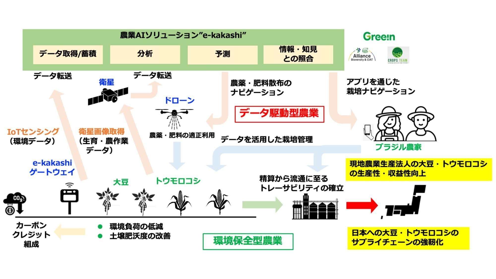 なお、本事業は、グリーンと連携の実績がある国際熱帯農業センター(Centro Internacional de Agricultura Tropical: CIAT、本部:コロンビア)、および現地のスタートアップであるクロップス・チーム有限会社(Crops Team Serviços de Consultoria, Pesquisa e Desenvolvimento LTDA)等と、コンソーシアムを形成して実施します。