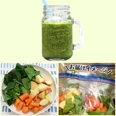 ※冷凍のカット野菜・果物をお送りいたします。スムージーをおつくり頂くためにはミキサーが必要となります。また、お手元に届いたらすぐに冷凍庫に入れて保存のうえ、なるべく早めにお召し上がり下さい。