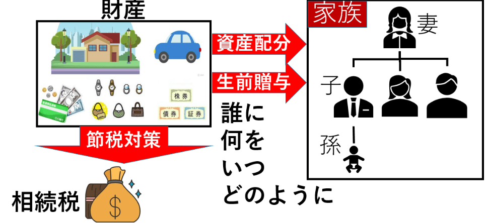 個人の財産を節税対策を考慮しながら、資産配分や生前贈与に対して家族事情を配慮して、誰に、何を、いつ、どのように相続するかの計画を立案シミュレーション