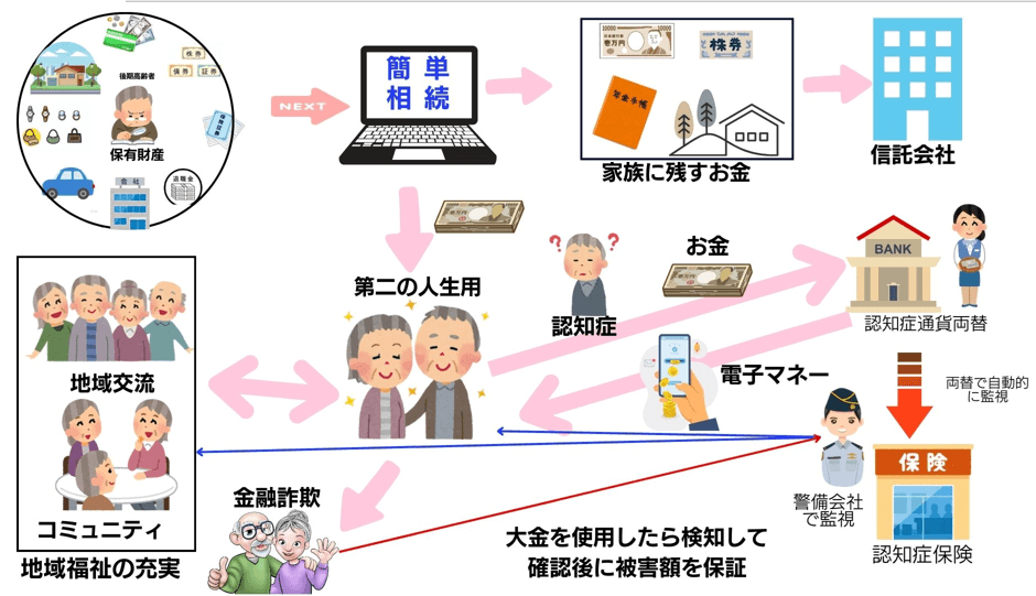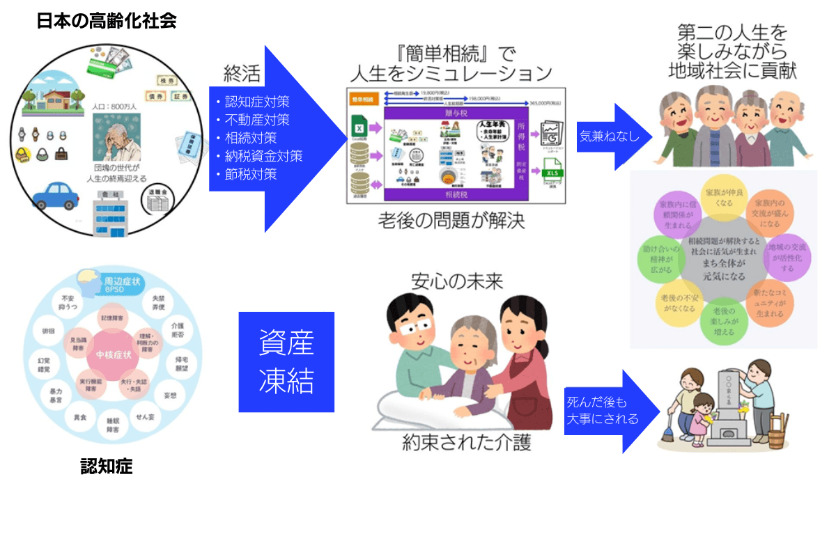 認知症になると、資産凍結が発生し資産移動や法的行為が全て無効となり、大きな資産負担が本人と家族に発生します。そうなる前に相続の備えをしておく必要がありますが、現状の制度利用では、一長一短があり、認知症発症後の資産管理に不満が残ります。資産計画を事前に立てておくことで、被相続人も家族も安心して相続を迎えることが可能となります。