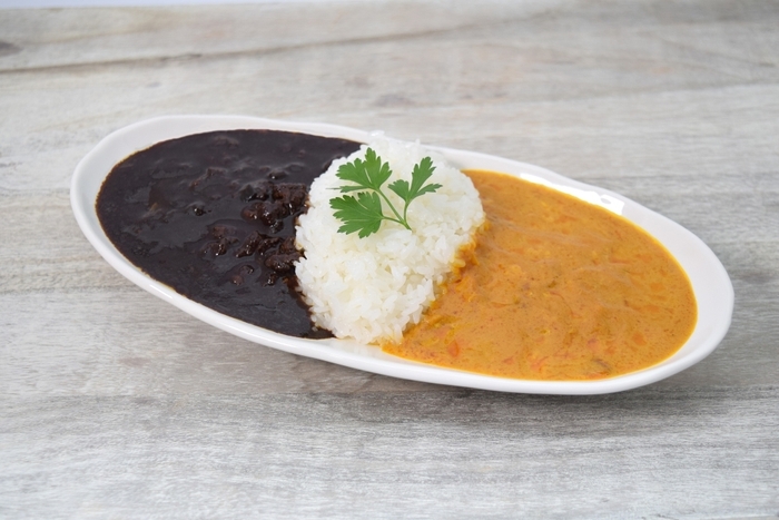 ライトラインのボディーカラーであるブラックとイエローをイメージしたあいがけカレーです。