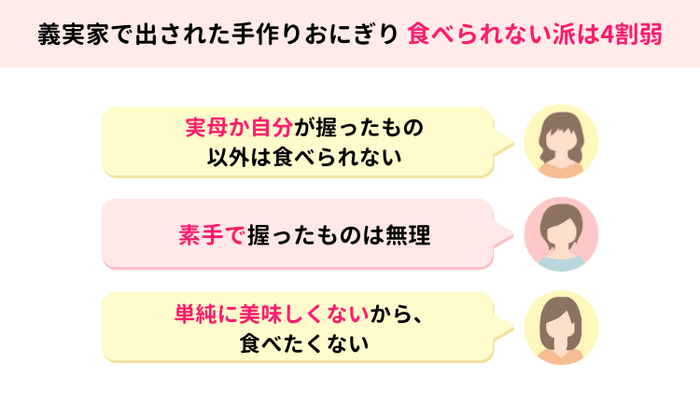 61.5%が「食べられる」と回答しました。「他人が握ったおにぎりでも抵抗はない」との意見が多数で、義実家であっても抵抗がないことは同じであるようです。また「お義母さんの料理や人柄が大好きだから」「綺麗好きなので安心している」など、義実家との良好な関係や衛生面での信頼があげられました。